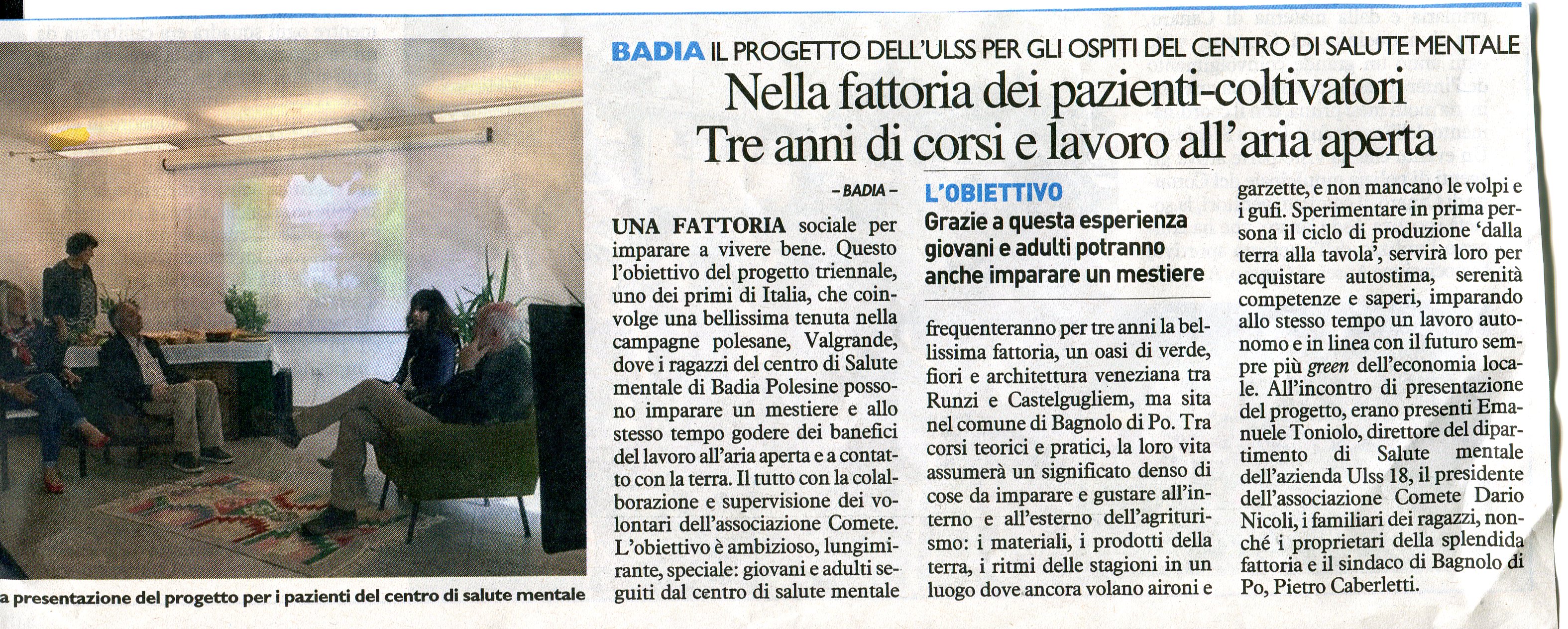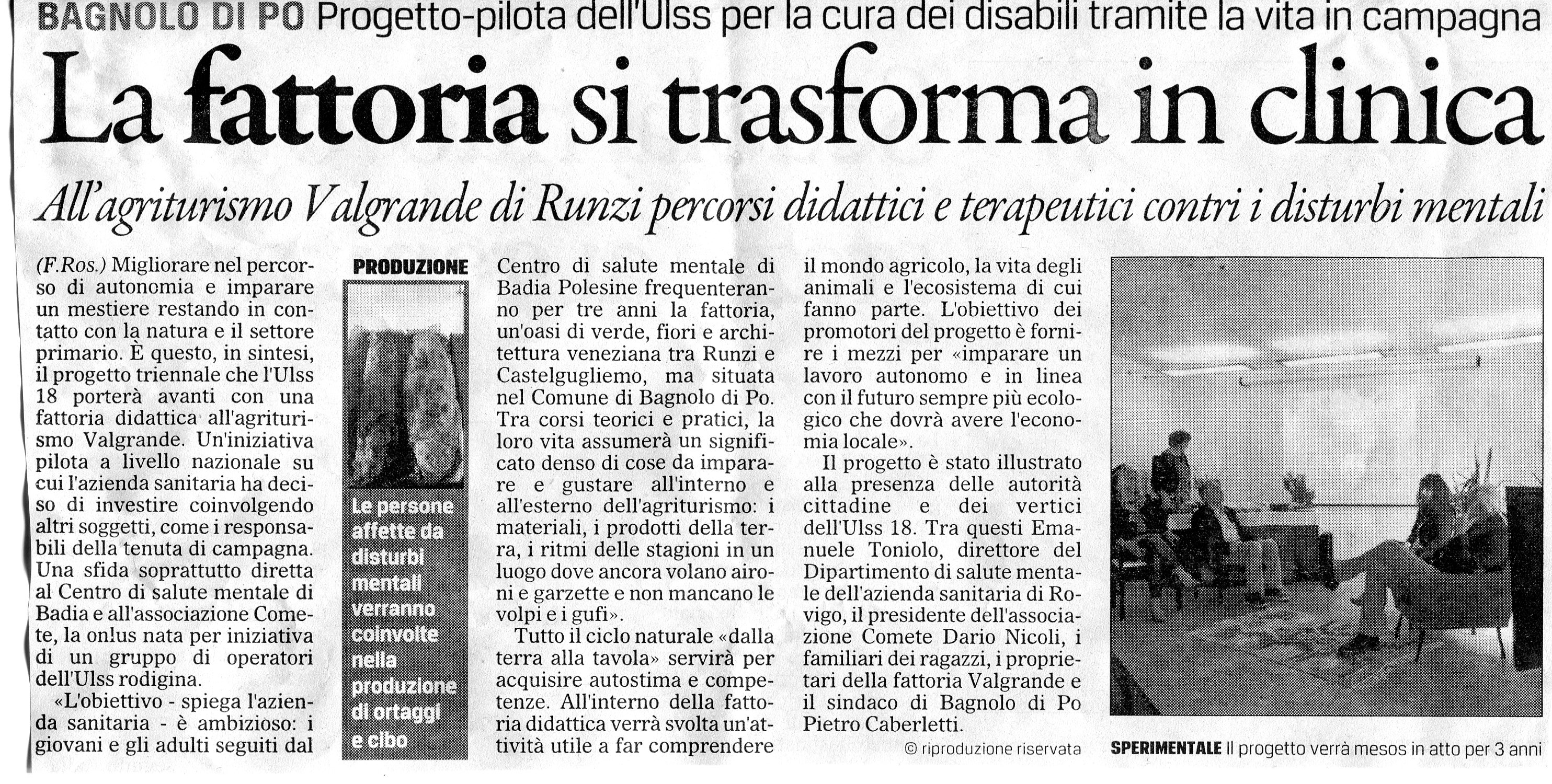 Il progetto “Insieme con Gusto”, promosso dall’Agriturismo Valgrande, l’Ulss 18 di Rovigo e l’ Onlus “Comete” è un progetto dalla durata triennale e vuole essere momento, per le persone con piccoli disturbi, per accrescere la propria autostima e le proprie competenze, inserite in un contesto rurale e legato al lavoro della terra e della trasformazione dei prodotti agricoli in alimenti per tutti.